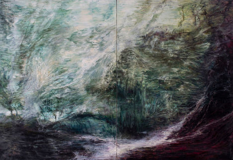 A gigantic face is vaguely distinguishable through the jungle, valley, vortex, waterfall and dense foliage full of the canvas. The face is visualized yet intangible. It is both observing and self-reflecting. Human lives in this world, being a part of this world, and the world is everything that forms human, a conception of Chinese philosophy that “The greatest image is formless.” An elf-like child figure can be seen in the centre of the canvas, surrounded by nature in an incongruous and contradictive manner, presenting a western notion of object relationships between nature and human.